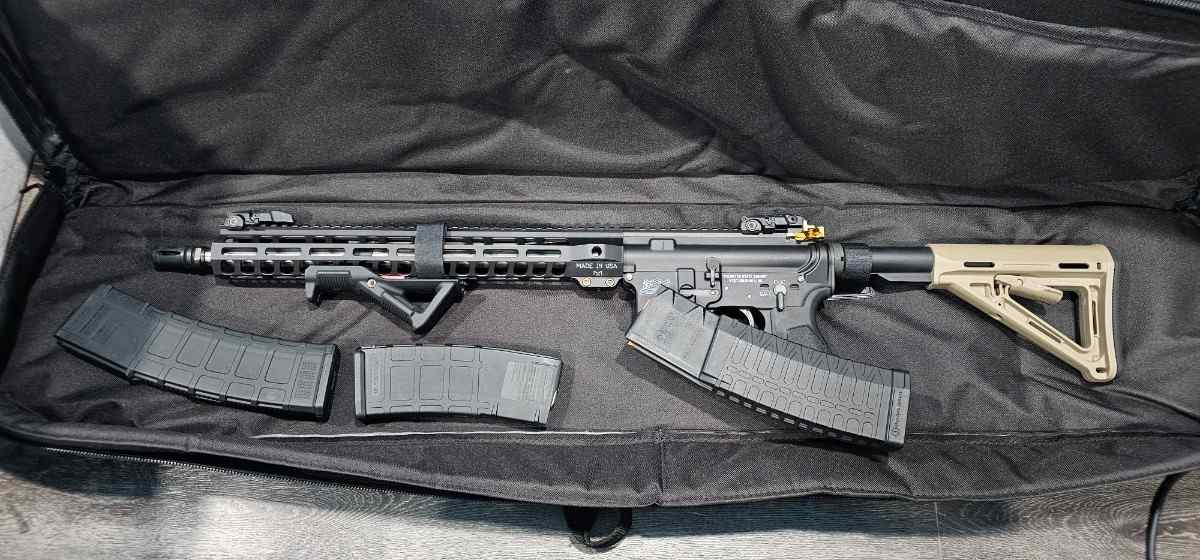 I built this rifle in 2019 with parts from Palmetto State Armory. It is a lightweight 16in with iron sights. Two 30rnd magazines, one 60rnd magazine and a basic case will come with it. Barely used, less than 500 rounds at the range. All parts totaled to $700